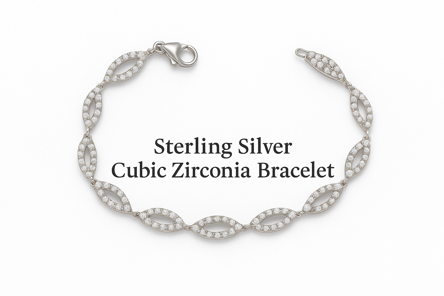 Designed with a sequence of marquise-shaped links, each encrusted with shimmering cubic zirconia stones for a radiant finish. Perfect for special occasions or adding a touch of sophistication to everyday wear.